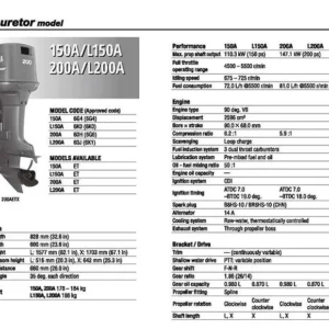The Yamaha 200AET outboard motor is a powerful and reliable two-stroke engine designed for recreational and commercial use. It features a 90-degree V6 engine with a displacement of 2596cc, producing a maximum output of 200 horsepower at 5000 RPM.